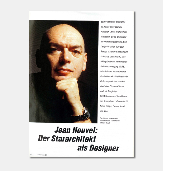 Jatzke-Wigand, H.: Jean Nouvel: Der Stararchitekt als Designer. In: wohnrevue, Schlieren 7/1997, 70-76
